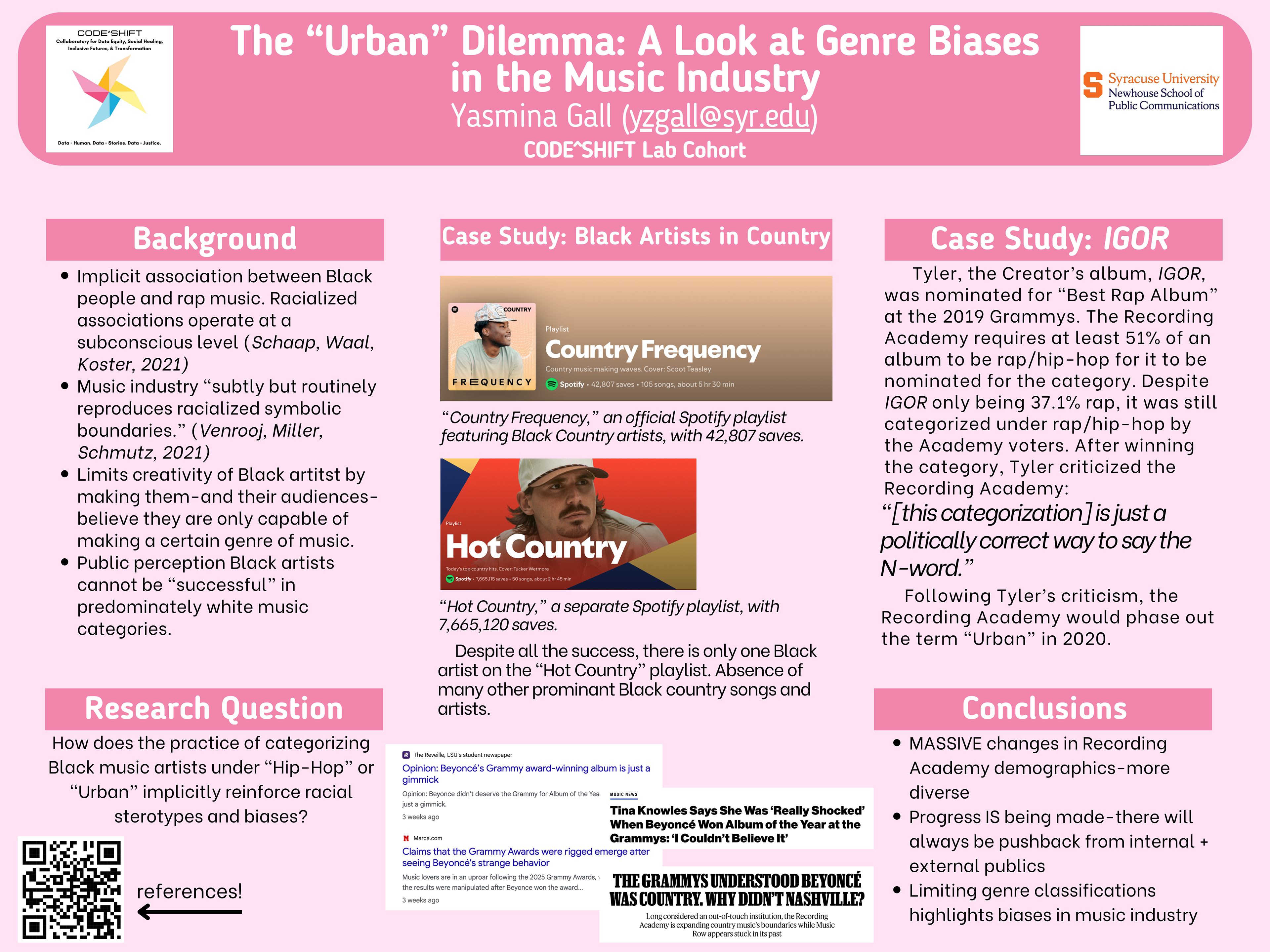 As part of Newhouse’s undergraduate research program, I conducted an independent project on social justice and media literacy, focusing on racial bias in the music industry. My research, “The Urban Dilemma: A Look at Genre Biases in the Music Industry,” examined how Black musicians are often boxed into certain genres and how those assumptions shape audience perception, industry treatment, and overall career trajectories. It was a deep dive into the way race and marketing intersect and how those biases quietly influence who gets visibility and who doesn’t.